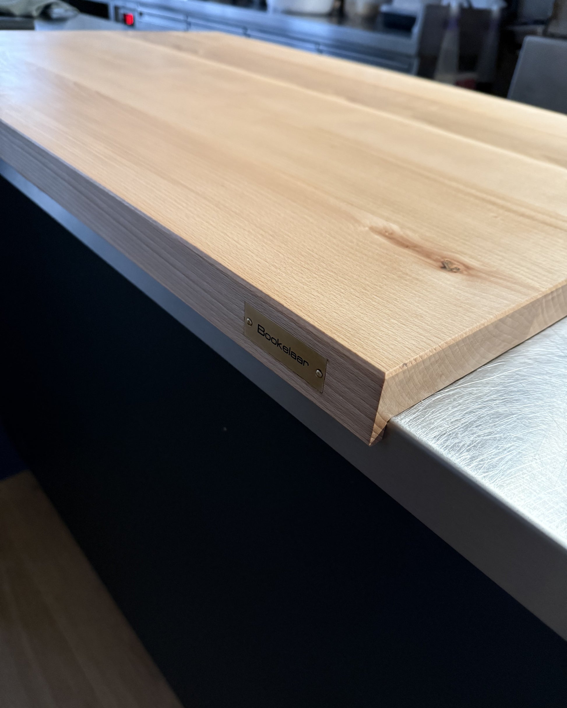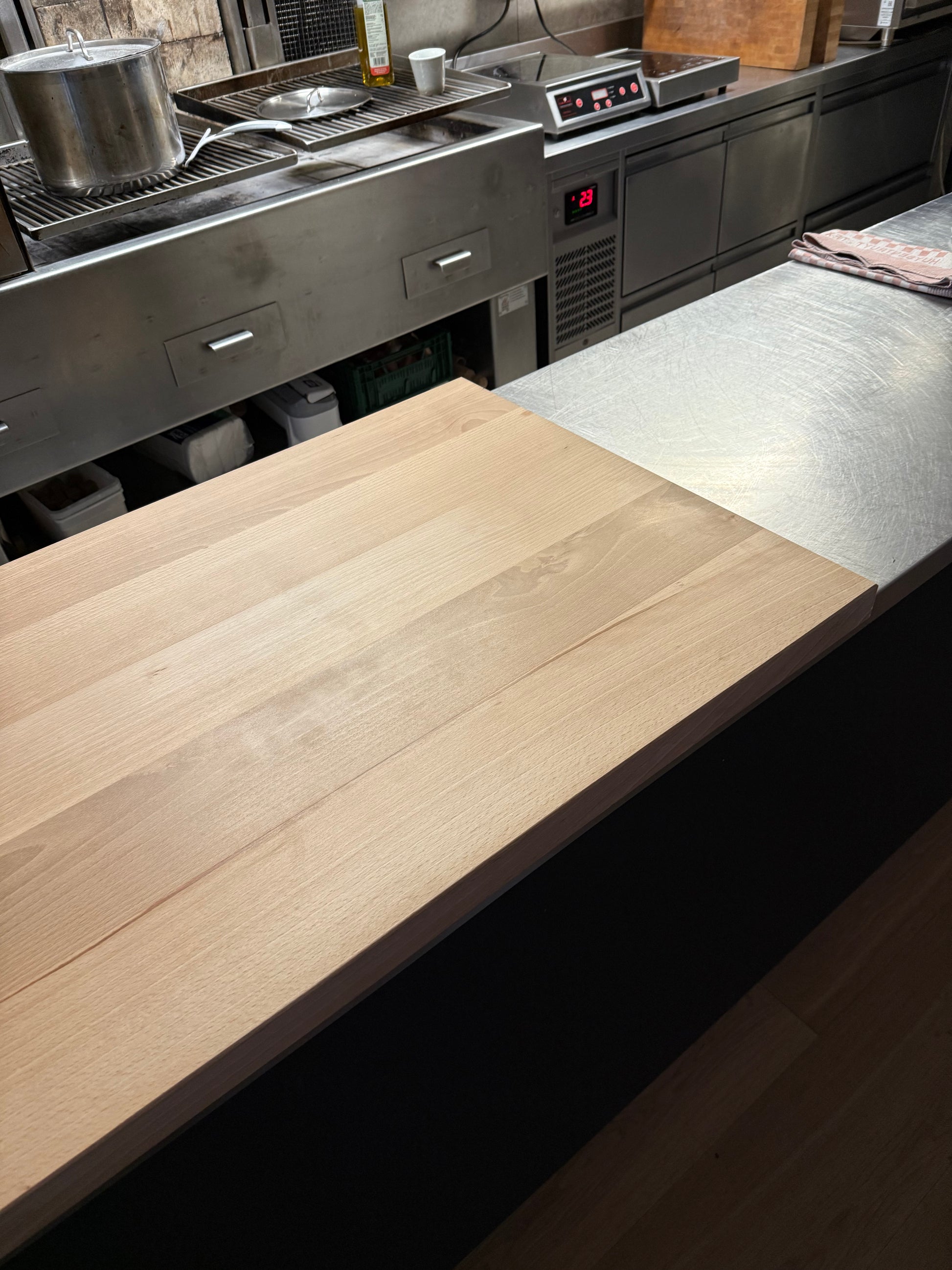 Deze extra grote plank (1000 x 62 x 30 mm) is met zorg ontworpen om perfect over zijn bestaande werkbank te vallen, compleet met een slimme uitsparing aan de onderzijde. Chef Guy koos voor een volledig massieve beuken plank, niet alleen vanwege de functionaliteit, maar ook omdat het prachtige beukenhout naadloos aansluit bij het interieur en de open keuken van Restaurant Nova.