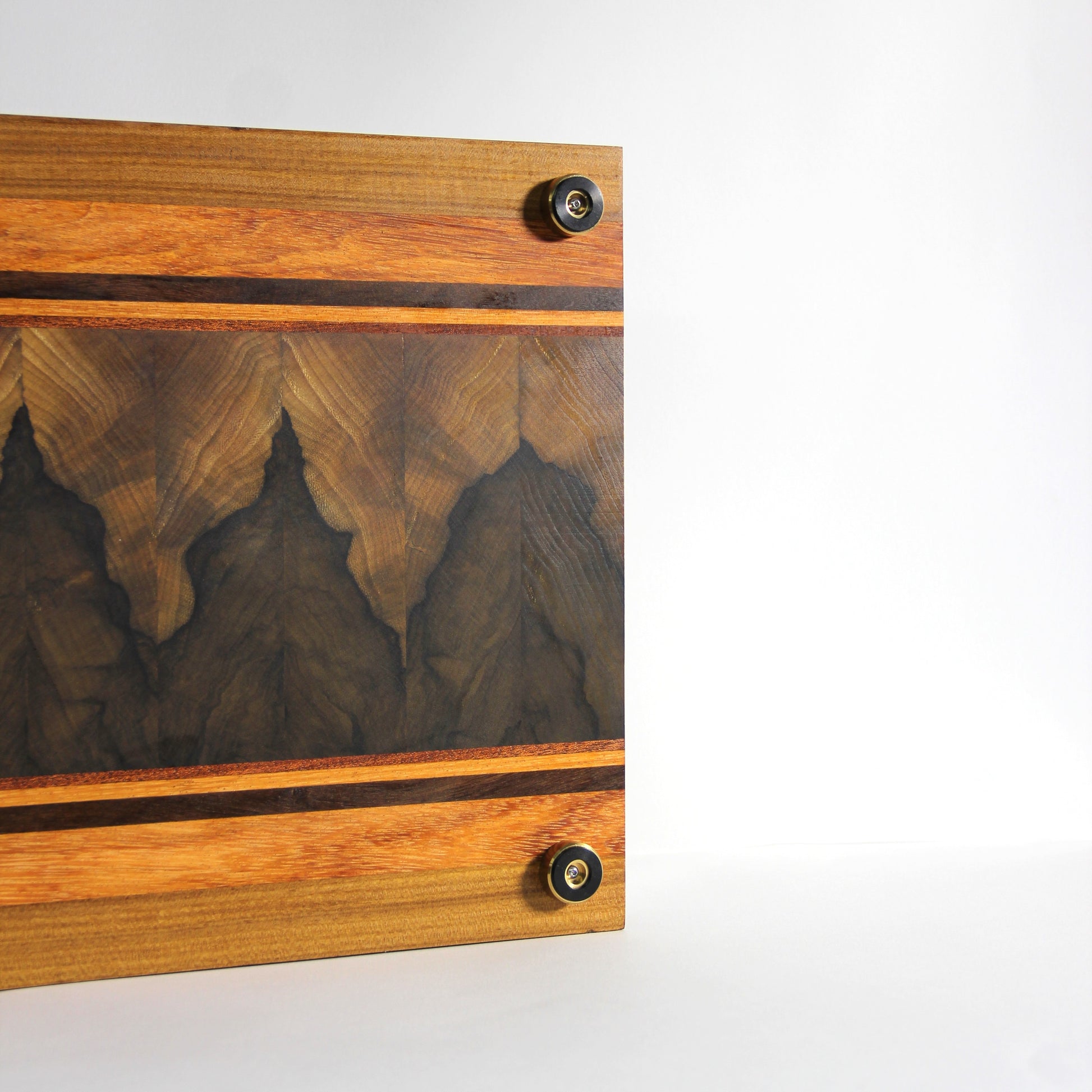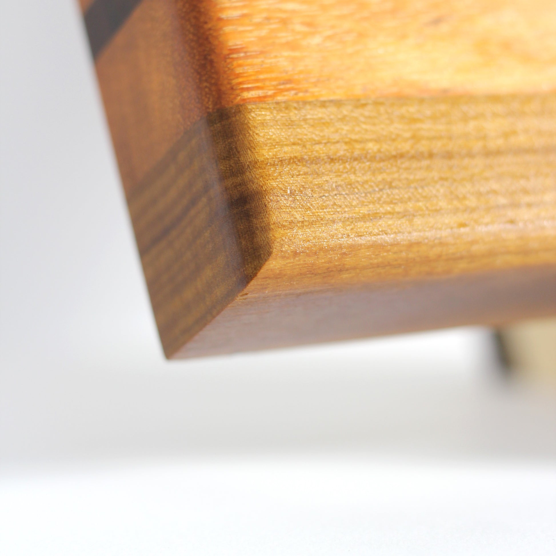 Deze extra dikke, handgemaakte snijplank (400x330x40mm) is een waar kunstwerk van hout. Het hart van de plank vormt een uniek patroon, ontstaan door de kopse kant van het Scandinavische grenenhout naar boven te plaatsen. Zo komen de natuurlijke groeiringen prachtig naar voren. De zijkanten, met hun zichtbare houtnerf en draad, zijn vervaardigd uit een combinatie van Frans eik, Sipo en Afrormosia.