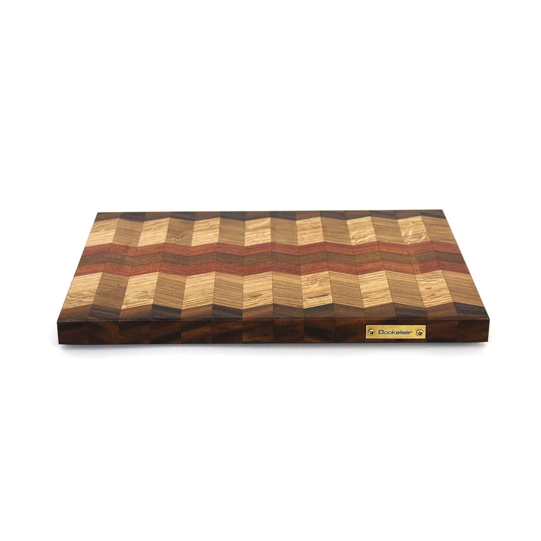 Deze handgemaakte snijplank (440x330x30) is een waar kunstwerk voor in de keuken. De snijplank is vervaardigd uit een zorgvuldige selectie van hoogwaardige hardhout soorten waaronder Sipo, Frans eik, Iroko en Afrormosia.